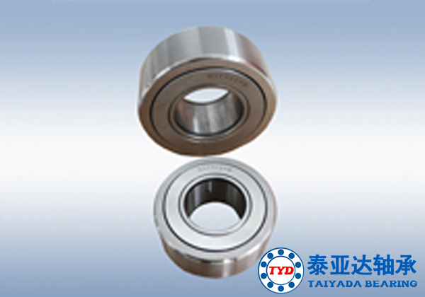 曲线滚轮轴承由一根作为滚子组内滚道的螺栓及一个厚壁外圈组成,螺栓轴的台肩及压在螺栓上的端面挡圈组成了外圈沿两个侧面方向的引导面。当曲线滚轮在平滚道或凸轮盘上运动时,由于外圈的弹性变形,滚轮的内应力加大。因此应用于此种工作情况下的额定负荷选择作为曲线滚轮一栏。